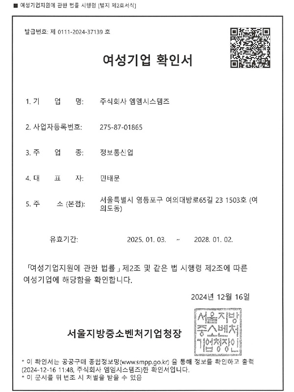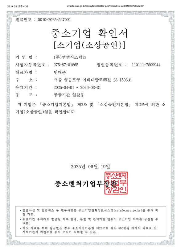 | 회사명 | ㈜엠엠시스템즈 MMSystems Co., Ltd. | 대표자 | 민태문 |